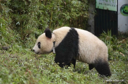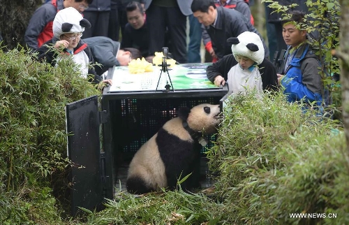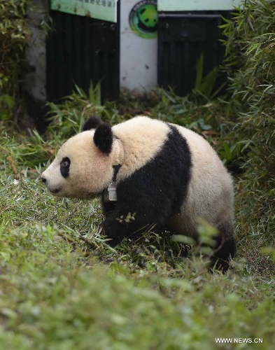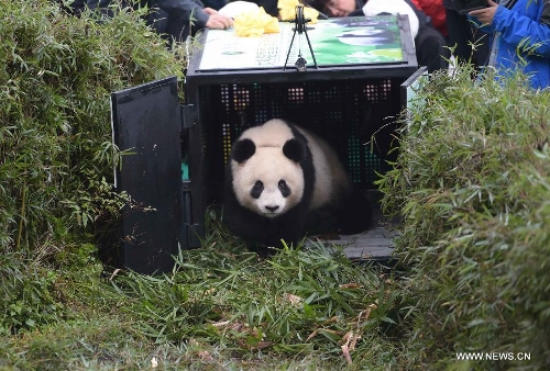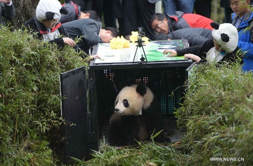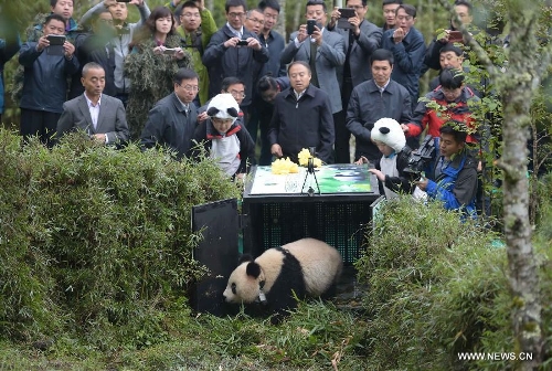Giant panda Xue Xue is released into the wild at the Liziping Natural Reserve in Shimian, Southwest China's Sichuan Province, Oct. 14, 2014. After two years' training in habitat selection, foraging, and avoiding natural enemies, the two-year-old female is believed to be able to survive in the Liziping Natural Reserve. Xue Xue is the fourth panda released into the wild after Xiang Xiang, Tao Tao and Zhang Xiang. (Xinhua/Xue Yubin)