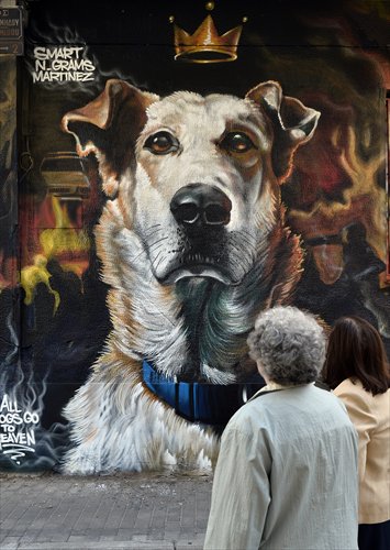 Women look at graffiti Tuesday depicting "Loukanikos" (sausage), a famous stray dog known as "riot dog" painted by artists Smart, N_Grams and Martinez in Athens in October. The stray dog, that became famous for joining Greek anti-austerity protestors a few years ago, recently died. Photo: AFP