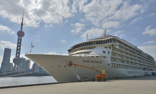 The World, a private residential cruise ship and one of the world's largest cruise liners, stopped at a port in Shanghai on Tuesday. It is the first time that the cruise ship has sailed into the city. Chinese people made 570,000 outbound cruise trips in 2013, and the number is expected to surpass 700,000 this year, according to the China Communications and Transportation Association. Photo: CFP