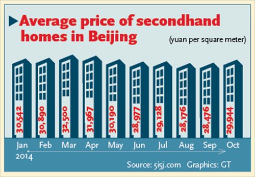 Data released Thursday by another property agency, 5i5j.com, also showed an increase in the average price of secondhand homes in Beijing to 29,944 yuan per square meter in October from 28,476 yuan in September.