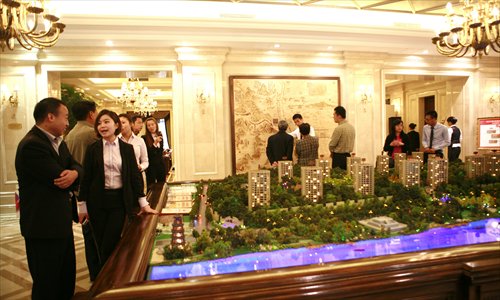 Potential homebuyers look at house models in a sales office in Beijing on October 1. Photo: IC