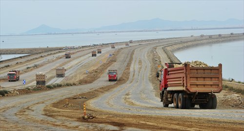 Lorries drive around a construction site for a new airport in Dalian, Northeast China's Liaoning Province in September. Photo: CFP