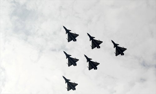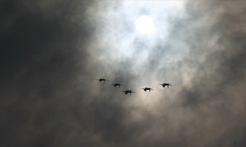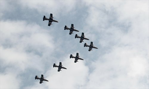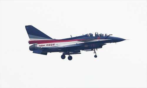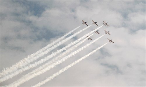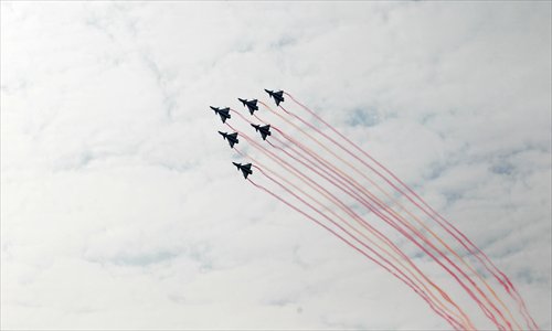 China’s August 1st Aerobatics Team performs with J-10 fighters at the 10th China International Aviation and Aerospace Exhibition in Zhuhai, Guangdong Province, on November 11. Photo: Cui Meng/GT