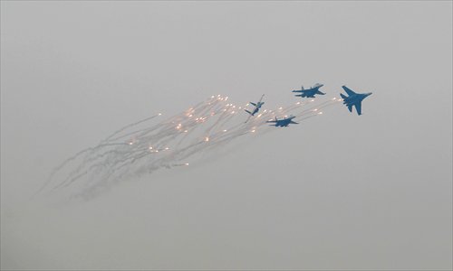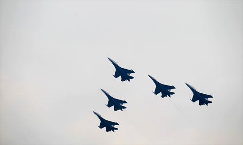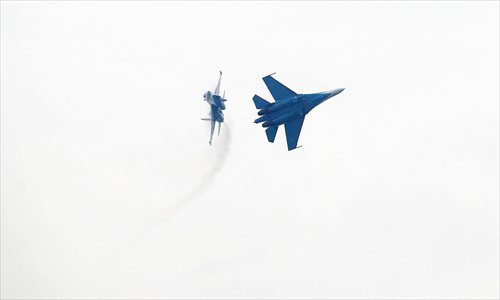 The Russian Knights team performs with Su-27 fighters at the 10th China International Aviation and Aerospace Exhibition in Zhuhai, Guangdong Province, on November 11. Photo: Cui Meng/GT