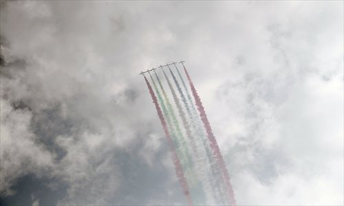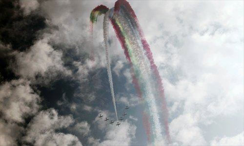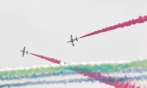 The United Arab Emirates Air Force “Fursan Al Emarat” Aerobatic Team performs at the 10th China International Aviation and Aerospace Exhibition in Zhuhai, Guangdong Province, on November 11. Photo: Cui Meng/GT