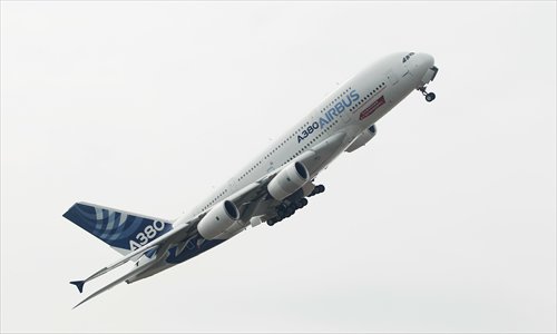The Airbus A380 aircraft, the largest plane to fly at Airshow China, boasts a 79.8-meter wingspan and 575-ton takeoff weight.