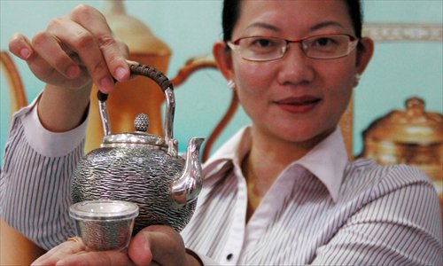 An ICBC staff showcases a silver teapot that is also a precious metal investment product at an exhibition in Haikou, capital of South China's Hainan Province on Friday. Photo: IC