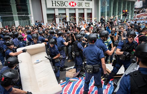 Police move a couch as they clear away an Occupy protest camp in the Mong Kok district of Hong Kong on Wednesday. More than 100 people were arrested during the operation in the past two days. Photo: AFP