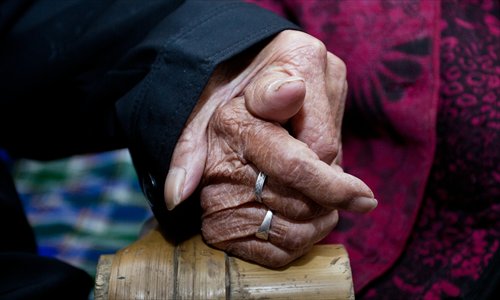 Ping Muhu holds the hand of Zhang Xinniu in their home in the village of Quanliu, administered by the city of Yuzhou in Henan Province. Photo: CFP