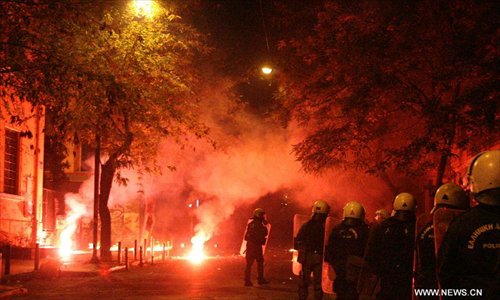 Riot police are seen during clashes in Athens' neighborhood of Exarchia, Greece, Dec. 6, 2014. The sixth anniversary of the killing of Greek teen Alexandros Grigoropoulos by police fire was marked on Saturday with a series of protests in Greece which ended in scuffles with anti-riot police in central Athens. Photo:Xinhua