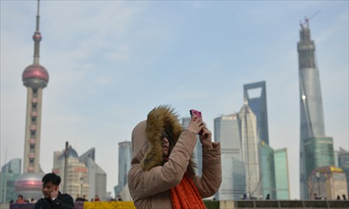 A visitor takes a photo on the street in Shanghai’s financial district on the Bund on March 13. China’s industrial output rose 8.6 percent in January and February year-on-year, official data showed, the worst result in nearly five years. However, Premier Li Keqiang downplayed worries over a slowdown of the world’s second-largest economy. Photo: AFP