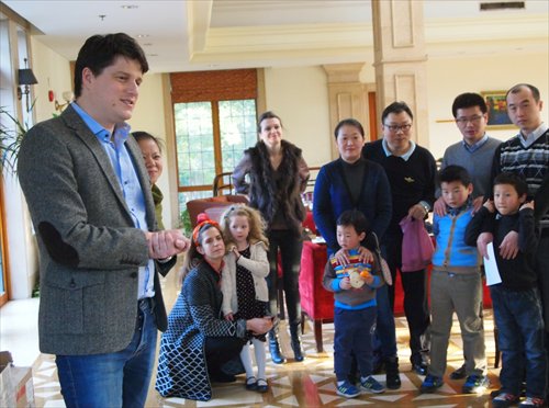 The Consul General of Luxembourg in Shanghai, Luc Decker, explains to children about the origin of Saint Nicolas Day Saturday.