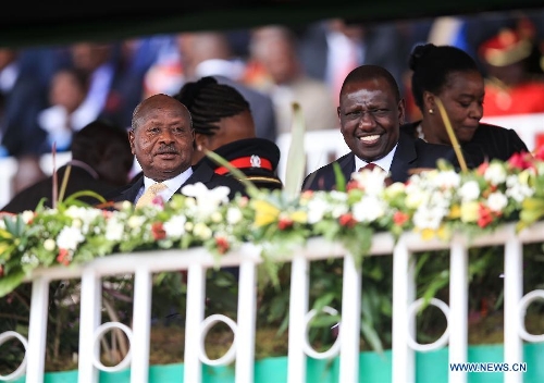 Ugandan President Yoweri Museveni (L) and Kenyan Deputy President William Ruto attend the 51th Jamhuri Day (Independence Day) celebration at the Nyayo National Stadium in Nairobi, capital of Kenya, Dec. 12, 2014. Kenya got its independence from British rule in 1963. (Xinhua/Meng Chenguang)