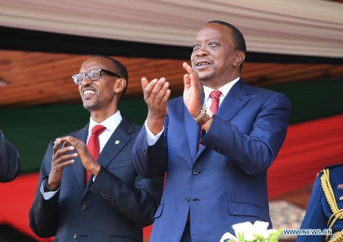 Kenyan President Uhuru Kenyatta (R) and Rwanda's President Paul Kagame watch flying performance of Kenyan Air Force during the 51th Jamhuri Day (Independence Day) celebration at the Nyayo National Stadium in Nairobi, capital of Kenya, Dec. 12, 2014. Kenya got its independence from British rule in 1963. (Xinhua/Meng Chenguang)