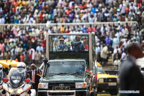 Kenyan President Uhuru Kenyatta waves hands to people during the 51th Jamhuri Day (Independence Day) celebration at the Nyayo National Stadium in Nairobi, capital of Kenya, Dec. 12, 2014. Kenya got its independence from British rule in 1963. (Xinhua/Meng Chenguang)