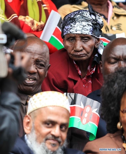 An aged woman attends the 51th Jamhuri Day (Independence Day) celebration at the Nyayo National Stadium in Nairobi, capital of Kenya, Dec. 12, 2014. Kenya got its independence from British rule in 1963. (Xinhua/Meng Chenguang)