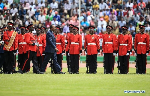 Kenyan President Uhuru Kenyatta inspects guards of honor during the 51th Jamhuri Day (Independence Day) celebration at the Nyayo National Stadium in Nairobi, capital of Kenya, Dec. 12, 2014. Kenya got its independence from British rule in 1963. (Xinhua/Meng Chenguang)