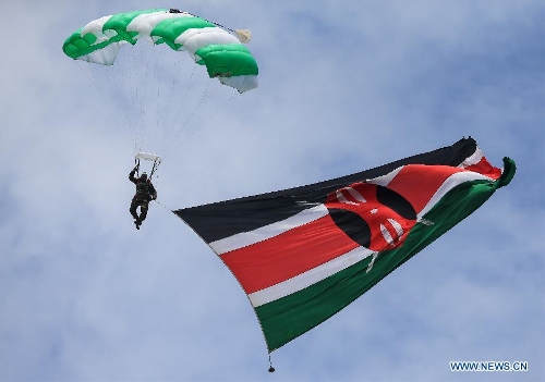 A Kenya parachuter performs during the 51th Jamhuri Day (Independence Day) celebration at the Nyayo National Stadium in Nairobi, capital of Kenya, Dec. 12, 2014. Kenya got its independence from British rule in 1963. (Xinhua/Meng Chenguang)