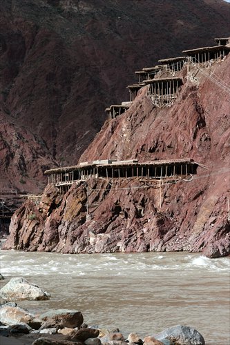 At the side of mountains along the Lancang River hang the ancient salt fields, elevated on wooden scaffolds.