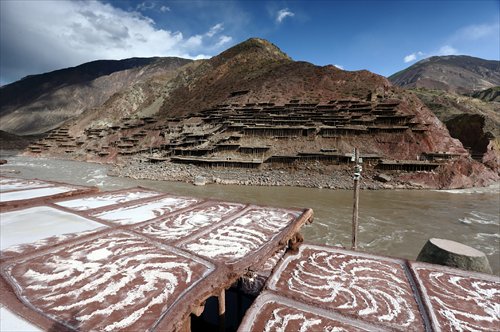 People of the Nakhi ethnic group, who live in riverside villages about three hours drive from the Mangkang county center, have been producing salt for at least 1,300 years. They carry brine water from wells by the riverside, which is rich in minerals, and unload it to the ponds for the sun to evaporate the water and rime the minerals.