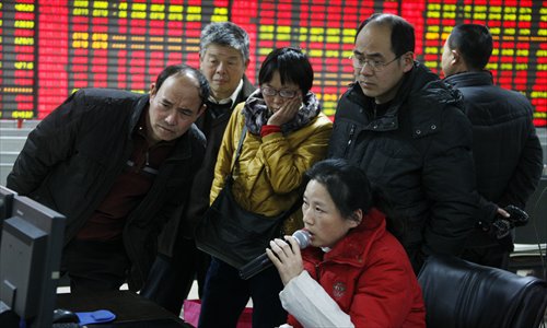 Investors look at share prices at a stock brokerage in Huaibei, East China's Anhui Province on Monday. Photo: IC
