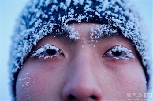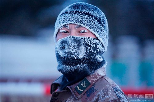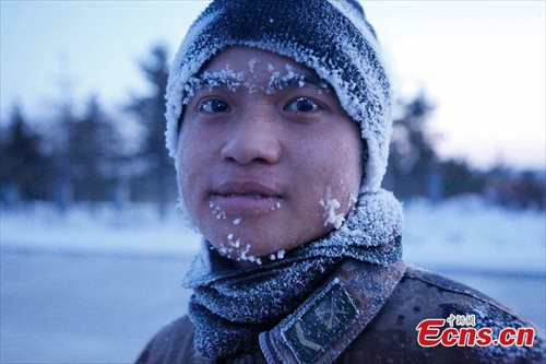 Chinese soldiers from border defense regiments take physical trainings braving minus 30 C temperature in Heihe, Heilongjiang province on December 16, 2014. Located at 50 degrees north latitude, Heihe city neighbors Blagoveshchensk in Russia across the Amur River, or Heilong Jiang. Temperature dips to as low as minus 50 C in its half-year-long winter. [Photo/CFP]