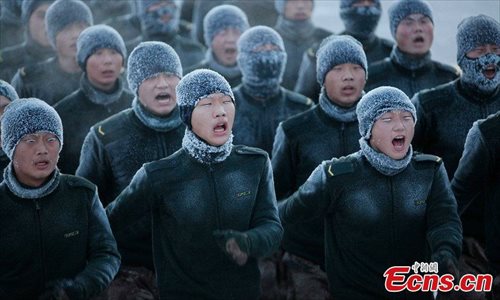 A soldier deployed on the border in Heihe, Northeast China's Heilongjiang province, receives training in snow on December 16, 2014. Located at 50 degrees north latitude, Heihe city neighbors Blagoveshchensk in Russia across the Amur River, or Heilong Jiang. Temperature dips to as low as minus 50 C in its half-year-long winter. Photo: ifeng.com