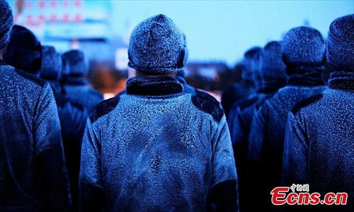 Chinese soldiers from border defense regiments take physical trainings braving minus 30 C temperature in Heihe, Heilongjiang province on December 16, 2014. [Photo/CFP]