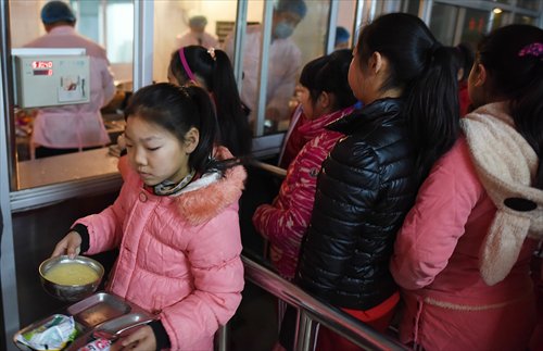 Lower circled: Students queue up for lunch in their school in Hengshui. Photo: Huang Liang