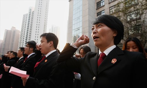 Employees at a local court in Shanghai take an oath on December 1 before the nation's first Constitution Day. Photo: CFP