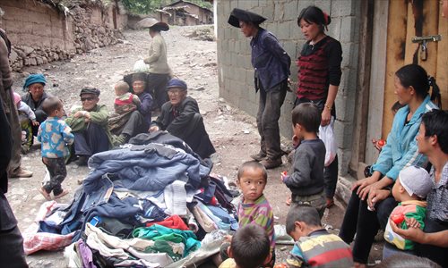 Qianjin villagers surround a pile of donated clothing on June 17. Photo: Huang Jingjing