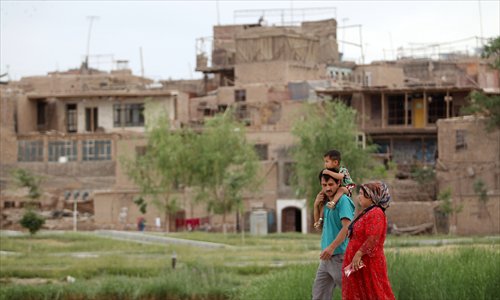 A Uyghur family walks through the old section of Kashgar, Xinjiang Uyghur Autonomous Region on May 30, 2014. Photo: Cui Meng/GT
