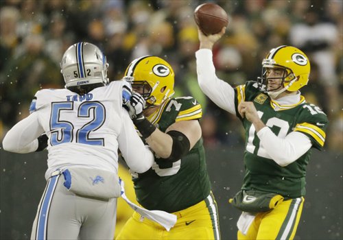Green Bay Packers' Aaron Rodgers (right) throws during the second half of an NFL game against the Detroit Lions on Sunday in Green Bay, Wisconsin. Photo: IC