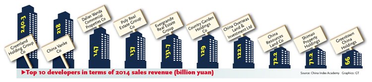 In 2014, 80 developers reported annual sales of over 10 billion yuan, nine more than in 2013, the China Index Academy, a Beijing-based real estate research institute, said in a report on Thursday. The total volume of commercial residential housing sales by the top 80 companies reached 2.8 trillion yuan and accounted for almost 40 percent of the market, the report said.