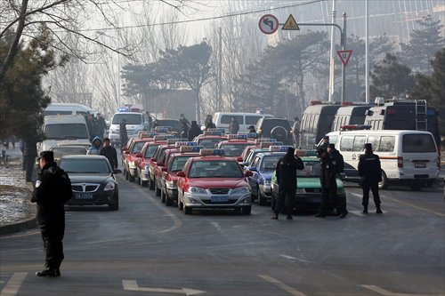 Police watch over cabs parked on a main street in Shenyang by striking taxi drivers Sunday. Photo: CFP