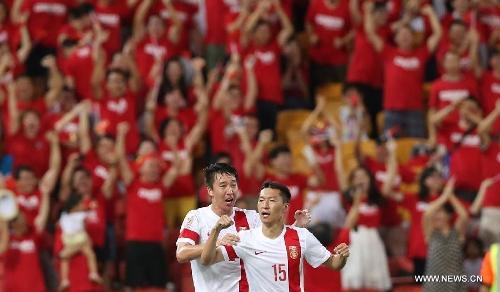 Wu Xi(R) of China celebrates scoring with his teammate Ren Hang during a Group B match between China and Uzbekistan of the AFC Asian Cup in Brisbane, Australia, January 14, 2015. Photo: Xinhua