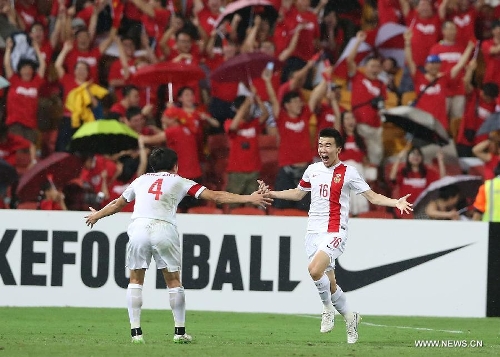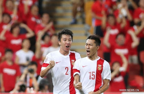 Sun Ke (R) of China celebrates scoring with his teammate Jiang Zhipeng during a Group B match between China and Uzbekistan of the AFC Asian Cup in Brisbane, Australia, January 14, 2015. Photo: Xinhua