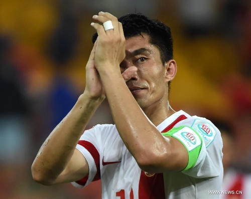 Zheng Zhi, captain of China, greets the spectators after the Group B match against Uzbekistan of the AFC Asian Cup in Brisbane, Australia, January 14, 2015. China won 2-1. Photo: Xinhua