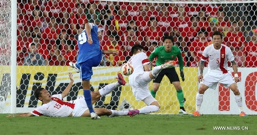 Players of China celebrate Sun Ke(C)'s goal during a Group B match against Uzbekistan of the AFC Asian Cup in Brisbane, Australia, January 14, 2015. China won 2-1. Photo: Xinhua