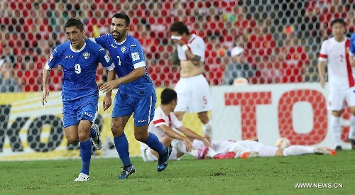 Odil Akhmedov(1st, L) of Uzbekistan celebrates after scoring during a Group B match between China and Uzbekistan of the AFC Asian Cup in Brisbane, Australia, January 14, 2015. Photo: Xinhua