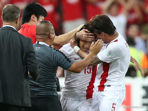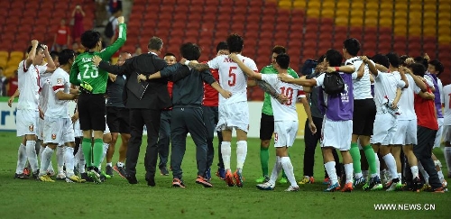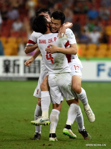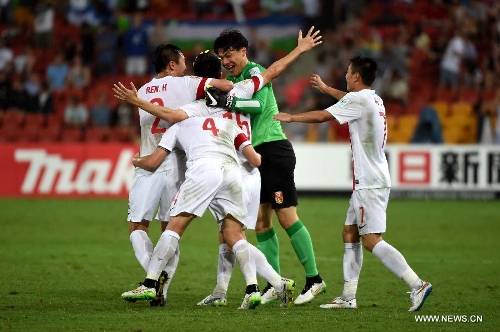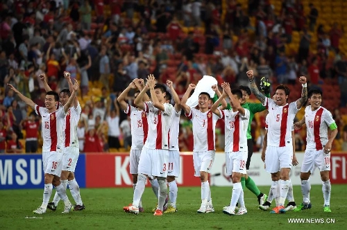 Players of China celebrate after the Group B match between China and Uzbekistan of the AFC Asian Cup in Brisbane, Australia, January 14, 2015. China won 2-1. Photo: Xinhua