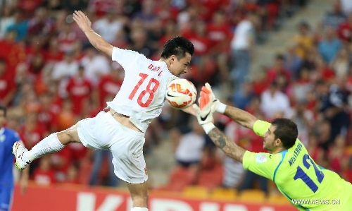 Odil Akhmedov of Uzbekistan scores during a Group B match between China and Uzbekistan of the AFC Asian Cup in Brisbane, Australia, January 14, 2015. Photo: Xinhua
