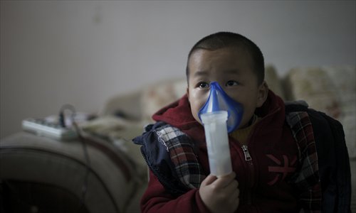 A 4-year-old boy with asthma receives treatment at home. Photo: CFP