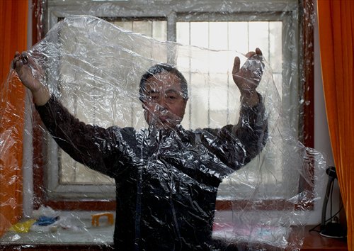 Huang Wangsheng has sealed all the windows at home with plastic film, but he refuses to leave the apartment he bought with his life savings. Photo: CFP