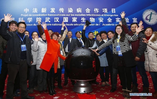Staff members celebrate during the completion ceremony of China's first high level biosafety laboratory in Wuhan, capital of central China's Hubei Province, Jan. 31, 2015. China completed its first high level biosafety laboratory based in Wuhan Saturday in Wuhan after more than a decade of construction. The lab will be used to study class four pathogens (P4), which refers to the most virulent viruses that pose a high risk of aerosol-transmitted person-to-person infections. (Xinhua/Yin Gang)