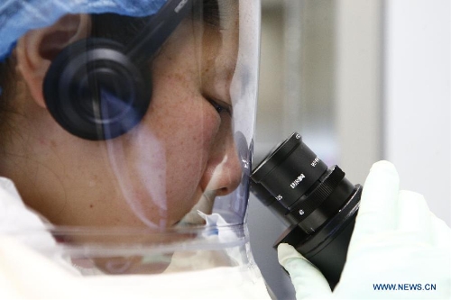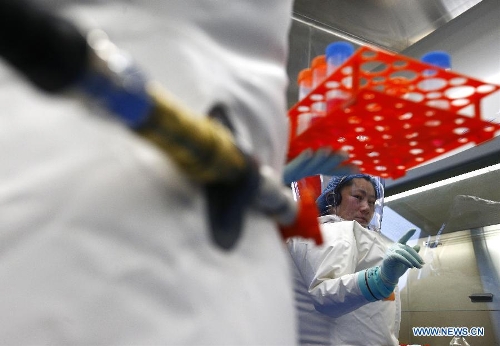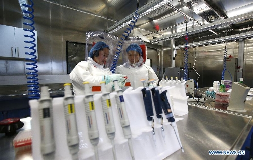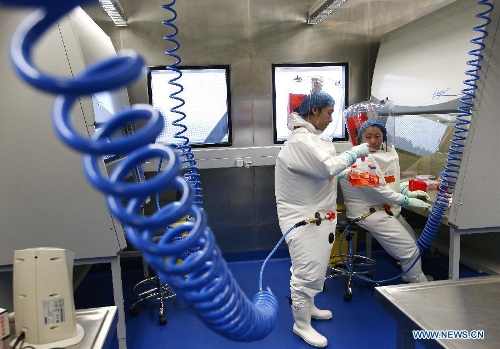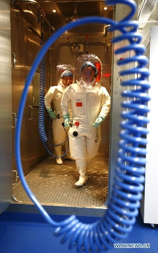 Researchers take part in a drill at the newly-completed lab in Wuhan, capital of central China's Hubei Province, Jan. 30, 2015. China completed its first high level biosafety laboratory based in Wuhan Saturday in Wuhan after more than a decade of construction. The lab will be used to study class four pathogens (P4), which refers to the most virulent viruses that pose a high risk of aerosol-transmitted person-to-person infections. (Xinhua/Yin Gang)