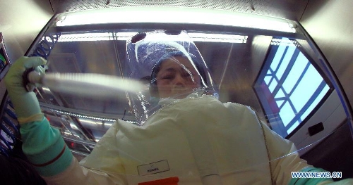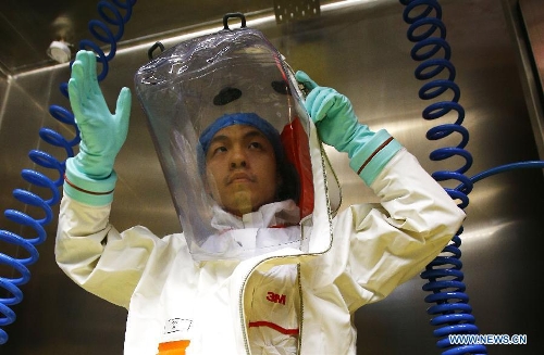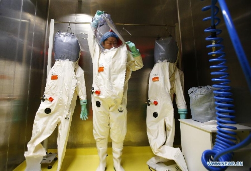 A researcher takes part in a drill at the newly-completed lab in Wuhan, capital of central China's Hubei Province, Jan. 30, 2015. China completed its first high level biosafety laboratory based in Wuhan Saturday in Wuhan after more than a decade of construction. The lab will be used to study class four pathogens (P4), which refers to the most virulent viruses that pose a high risk of aerosol-transmitted person-to-person infections. (Xinhua/Yin Gang)