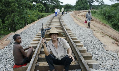 An unidentified Chinese railway worker drills holes on the newly put tracks on April 4, 2007 in Dondo, Angola. Photo: CFP