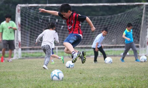Children practice football in a youth football training camp in Hangzhou, Zhejiang Province, in September. Photo: CFP
