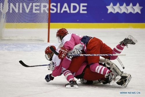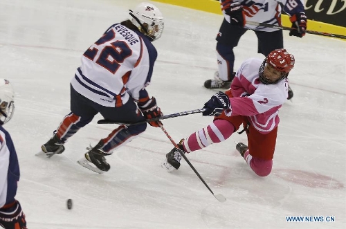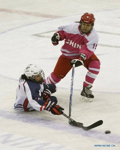 China's Kong Minghui (R) competes during the women's ice hockey competition against the United States at the 27th World Winter Universiade in Granada, Spain, Feb. 5, 2015. China won 2-1. (Xinhua/Meng Yongmin)